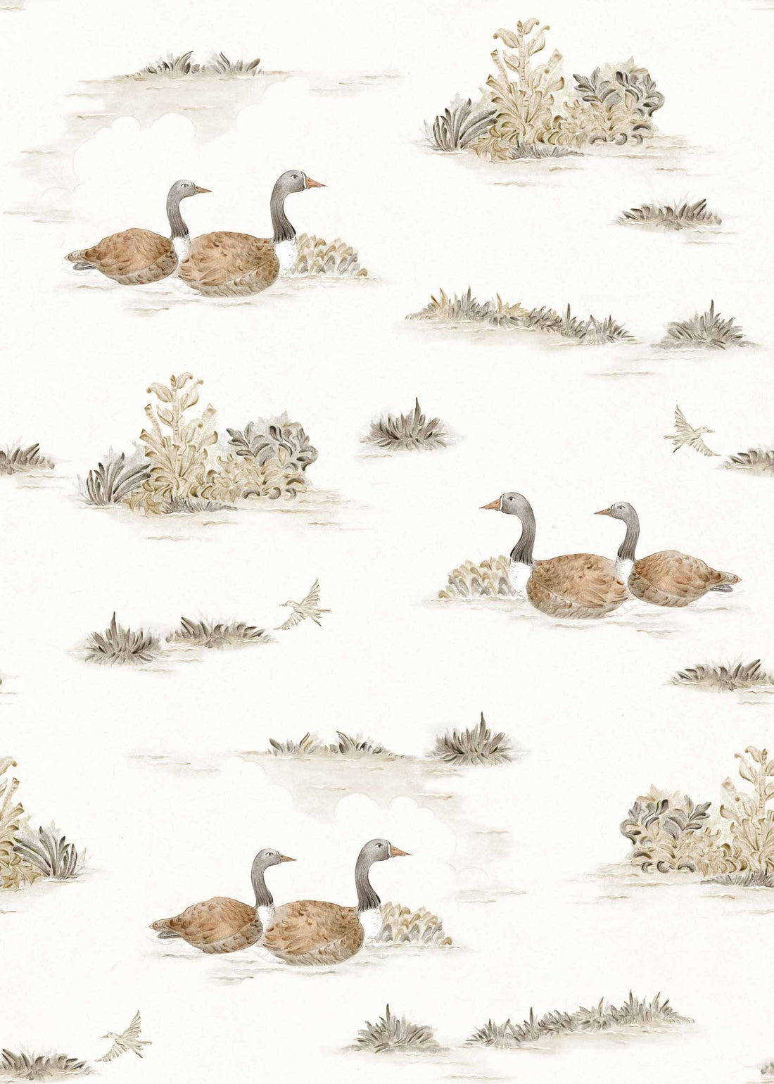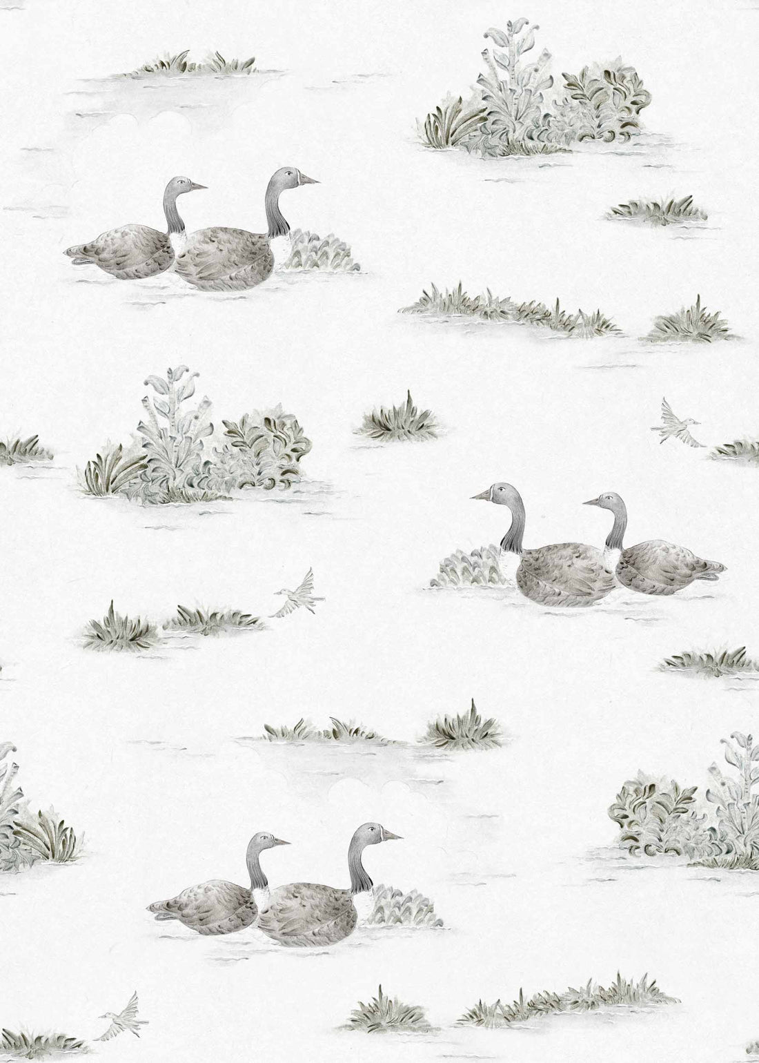 El papel pintado Duck muestra la delicadeza de los patos deslizándose entre juncos y nenúfares....