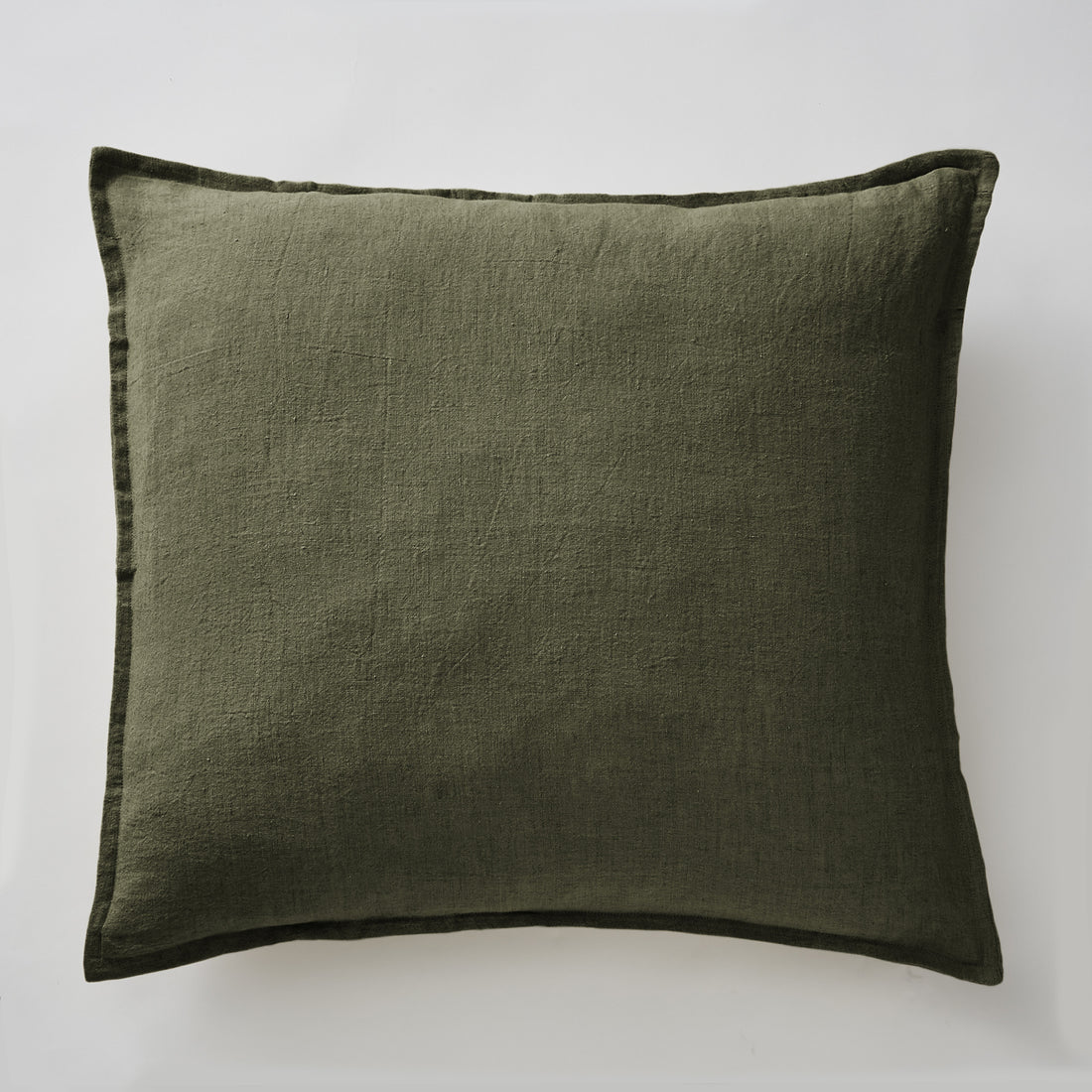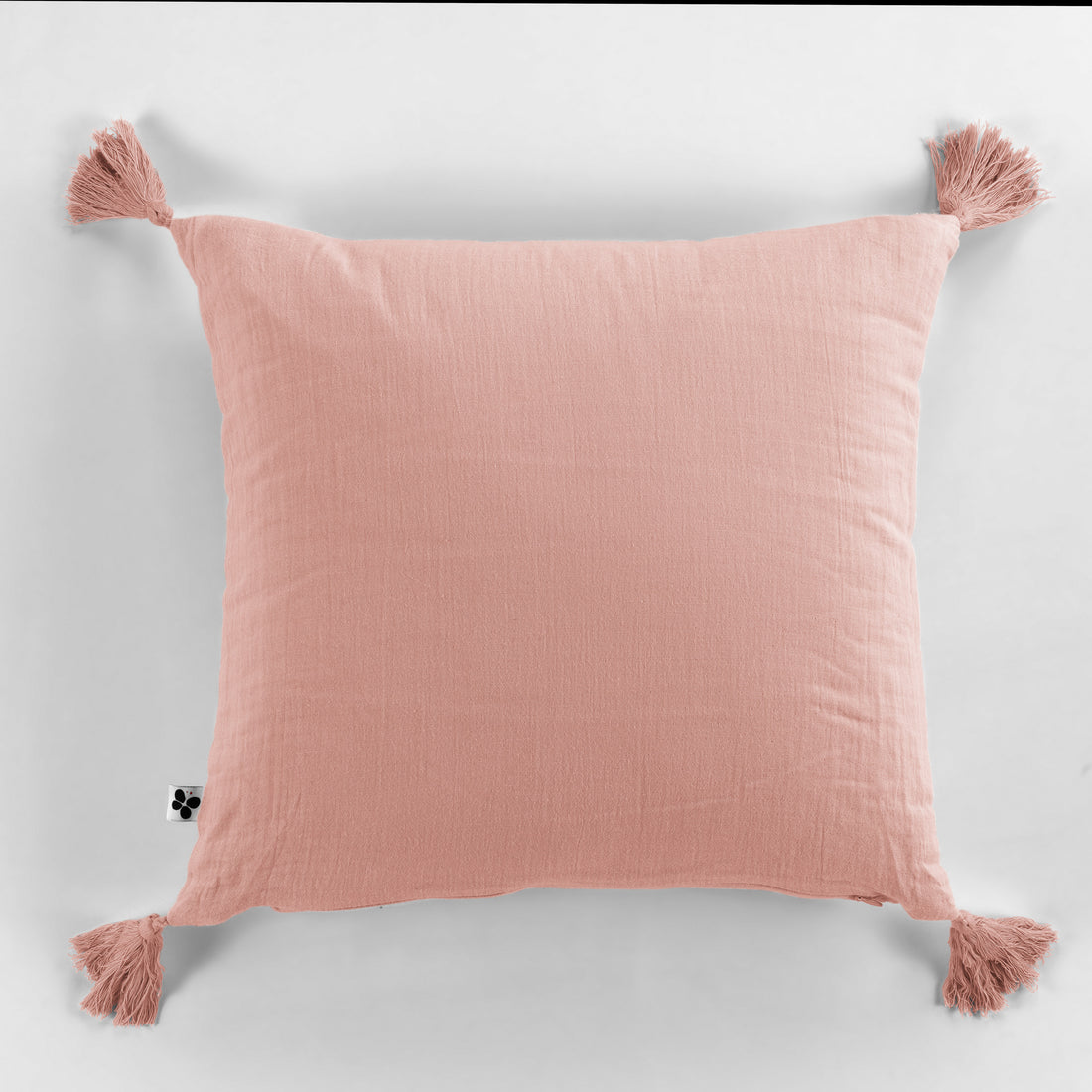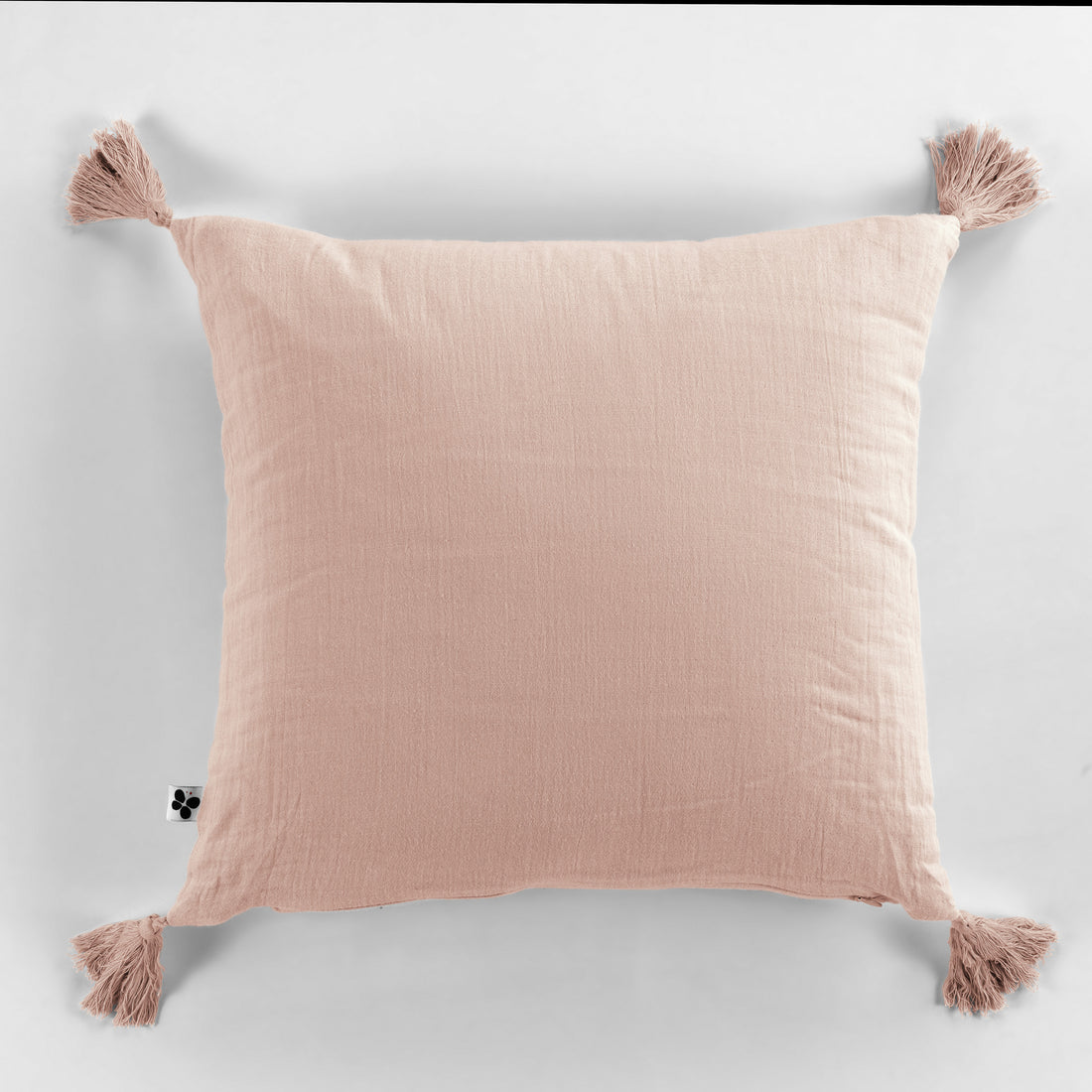 Cojín en lino lavado con pompones de yute en las esquinas.