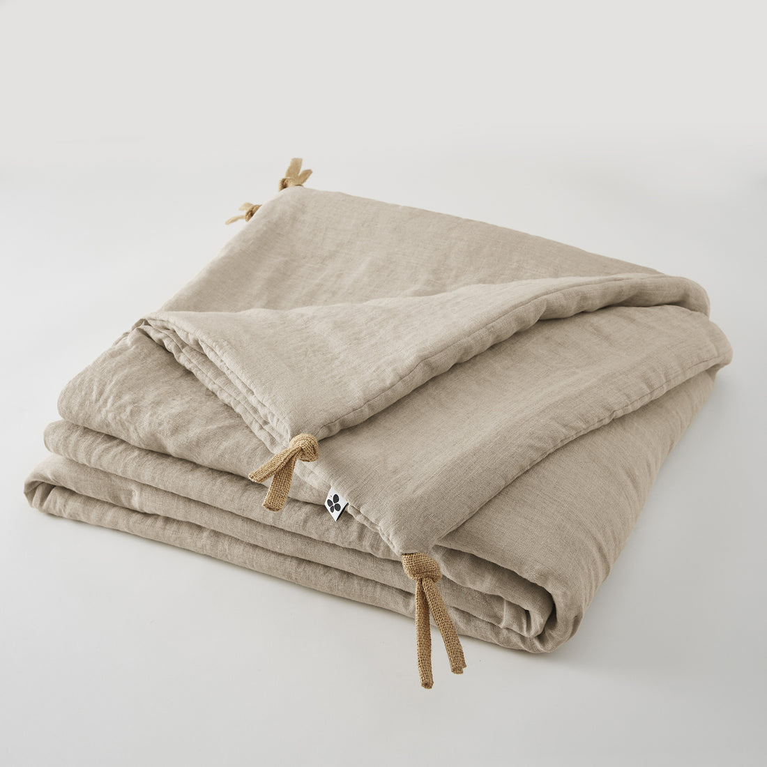 Camino de cama/edredón en lino lavado con pompones de yute en las esquinas.