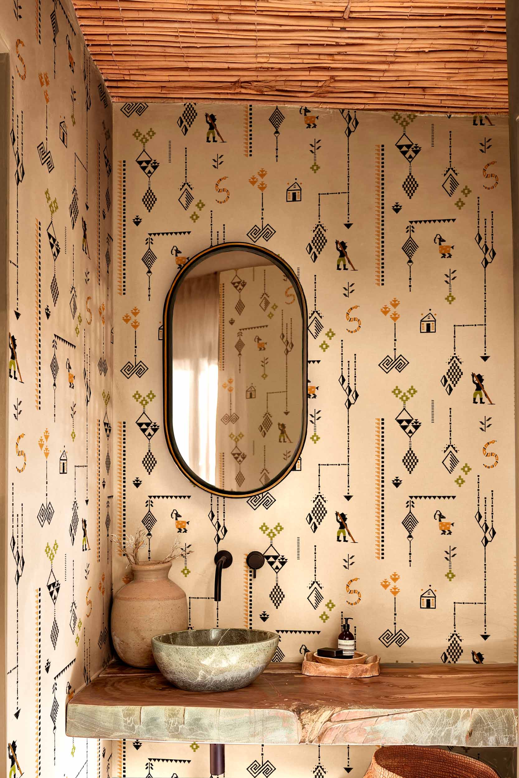 El papel pintado Criollo es un diseño de inspiración animal que representa escenas cotidianas de la vida rural, donde cabras criollas y pastores conviven en armonía. Un papel pintado que transmite autenticidad, calma y el encanto de lo sencillo.