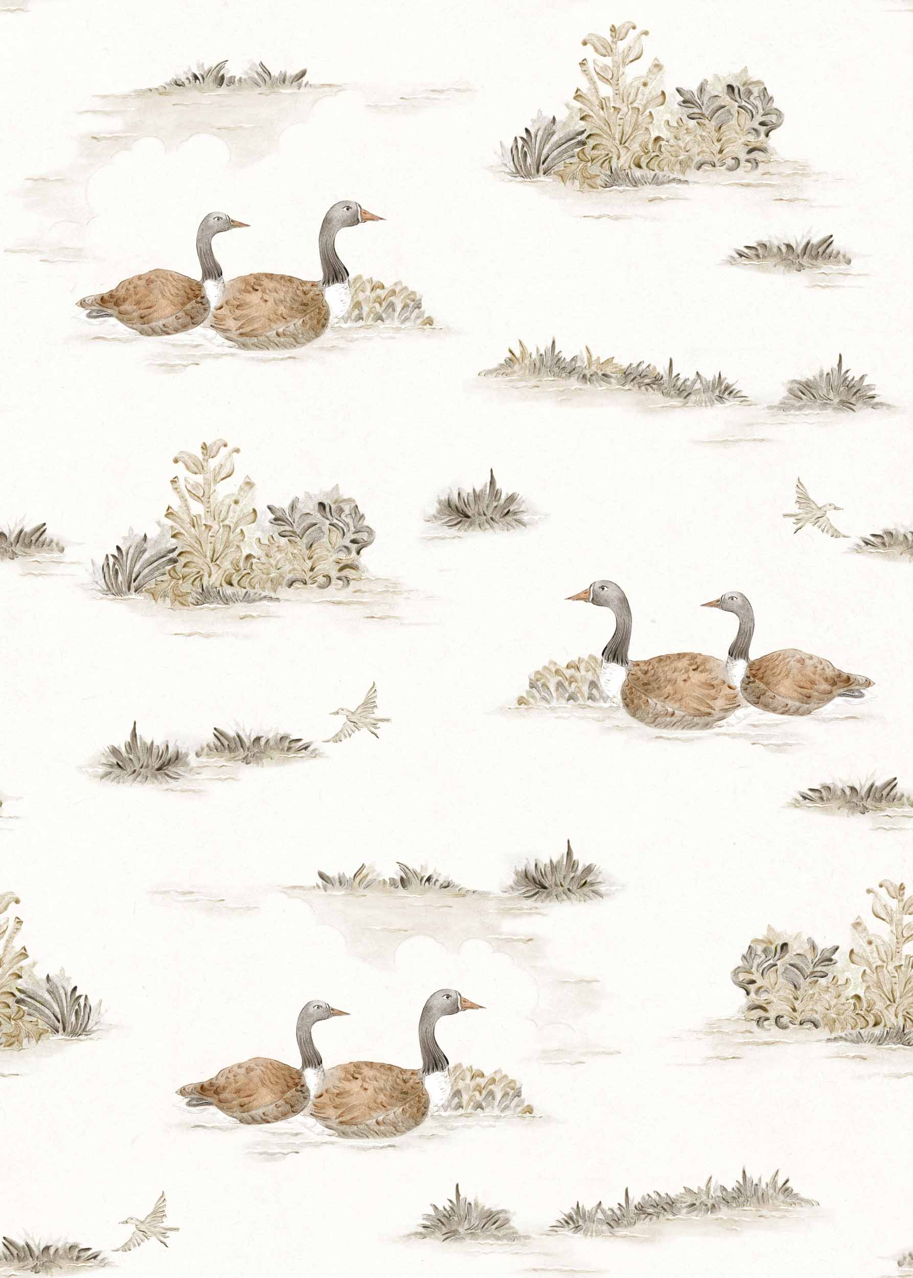 El papel pintado Duck muestra la delicadeza de los patos deslizándose entre juncos y nenúfares. Un papel pintado que transmite calma y estilo natural, ideal para crear ambientes relajantes y sofisticados.