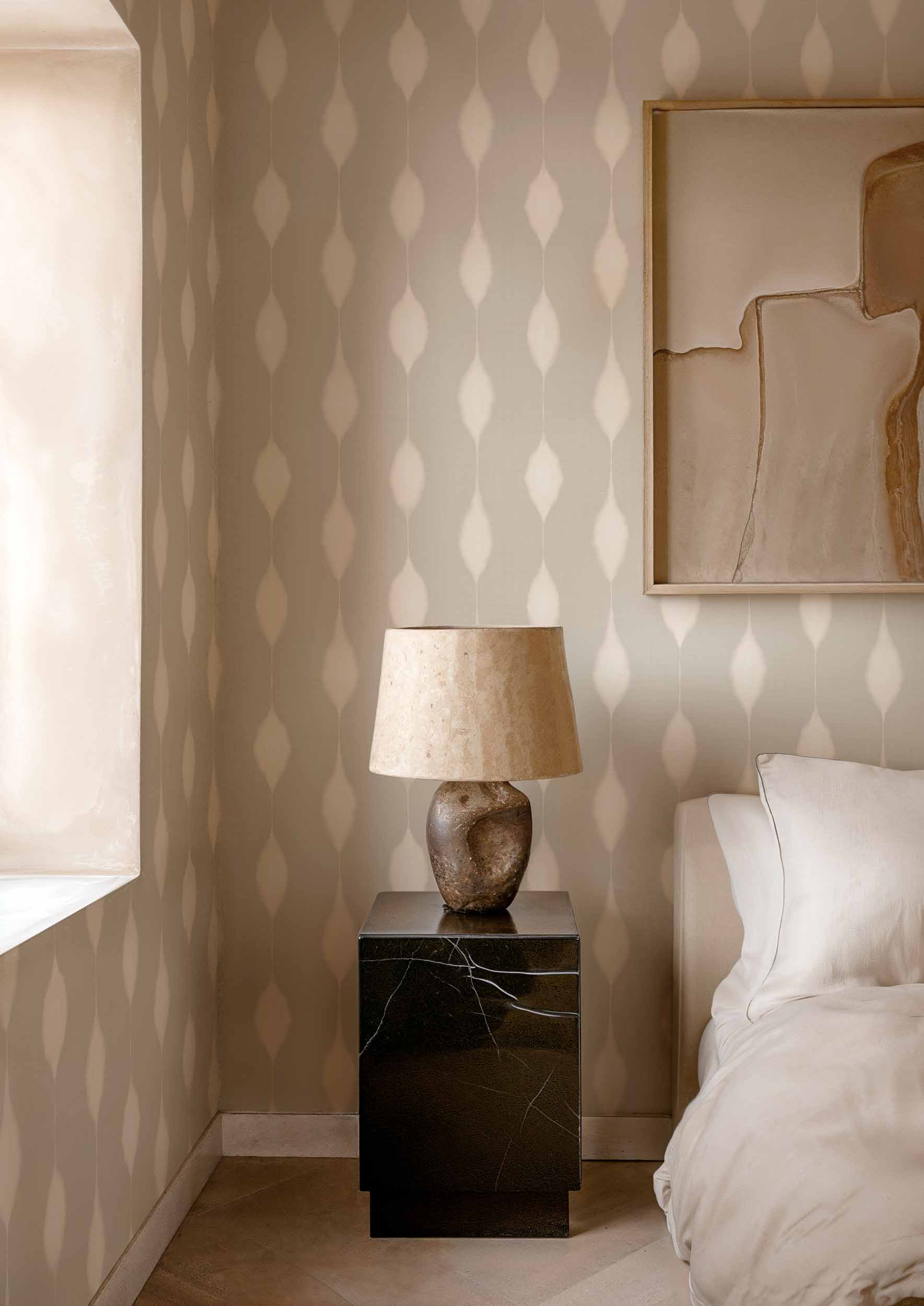 El papel pintado Kumo Cloud tiene un diseño de rayas en blanco/gris, haciendo referencia a la transformación orgánica de la seda.