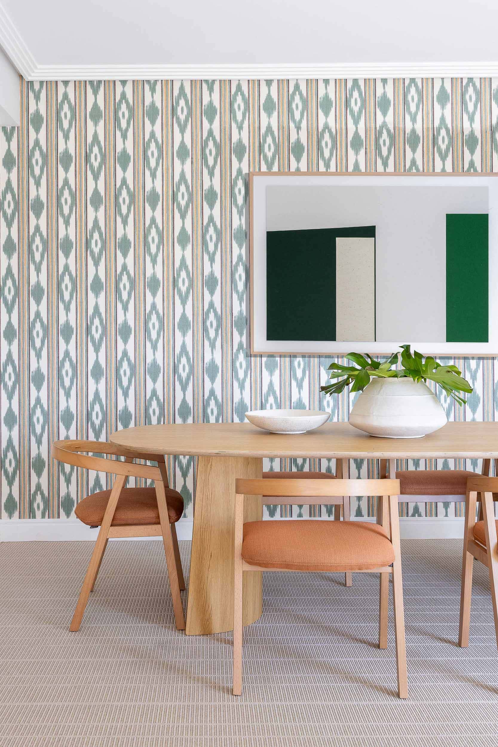 El papel pintado Lloseta es un diseño de la colección Mallorca que ofrece una combinación de rayas y formas abstractas que combina diferentes tonalidades cuidadosamente seleccionadas.