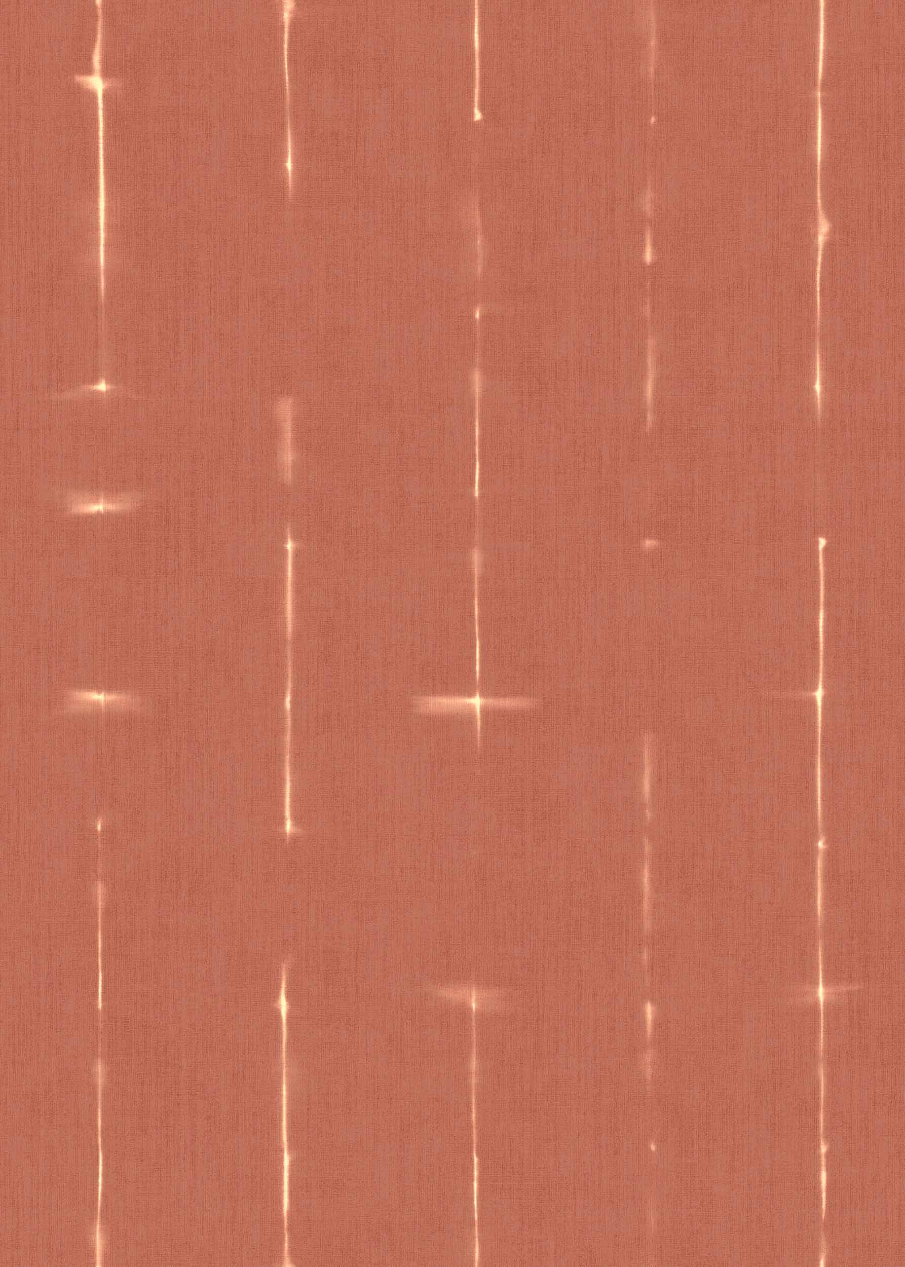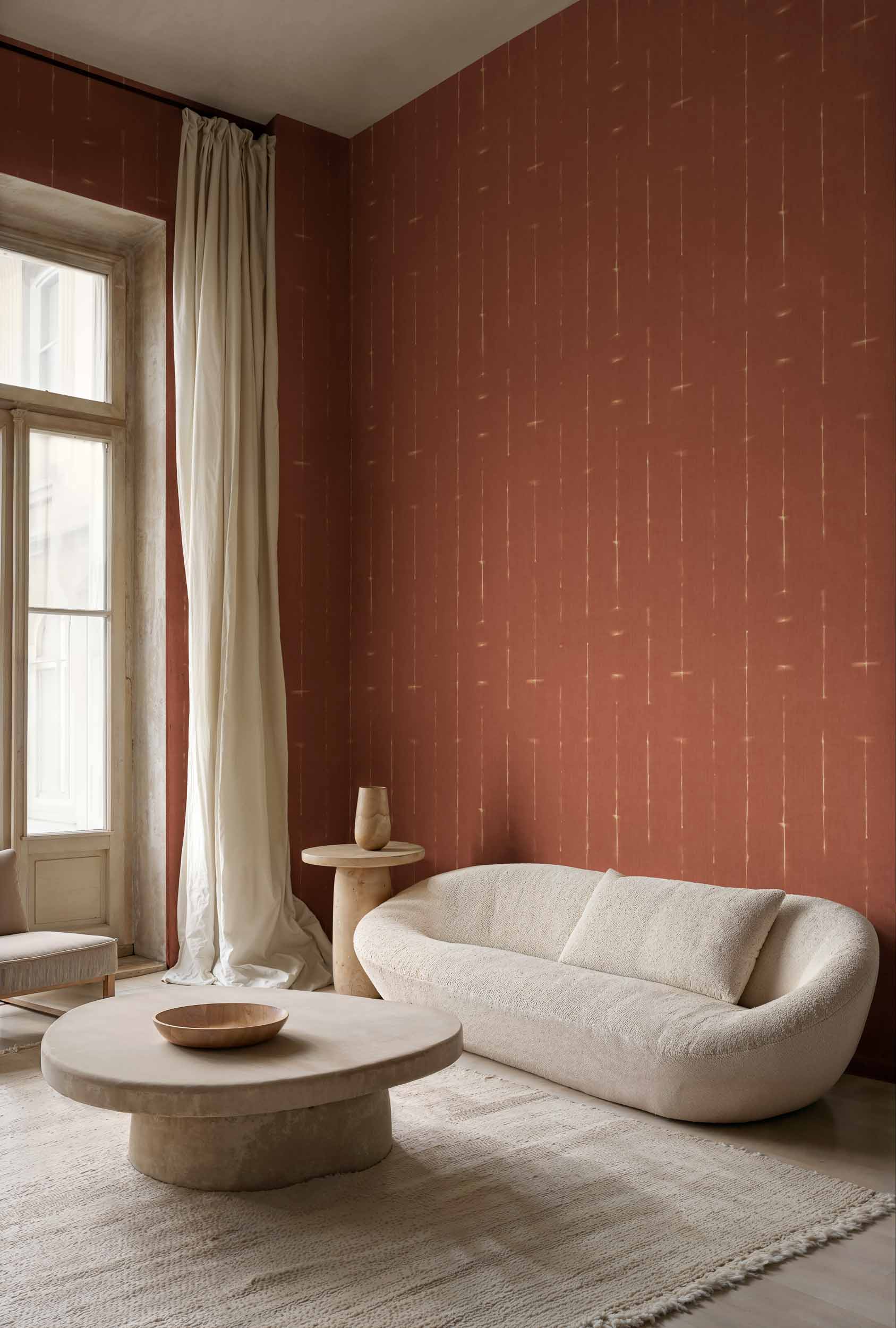 El papel pintado Miura Amber, con su delicado diseño de rayas en tonos anaranjados, evoca la sutil fluidez de los susurros del viento.