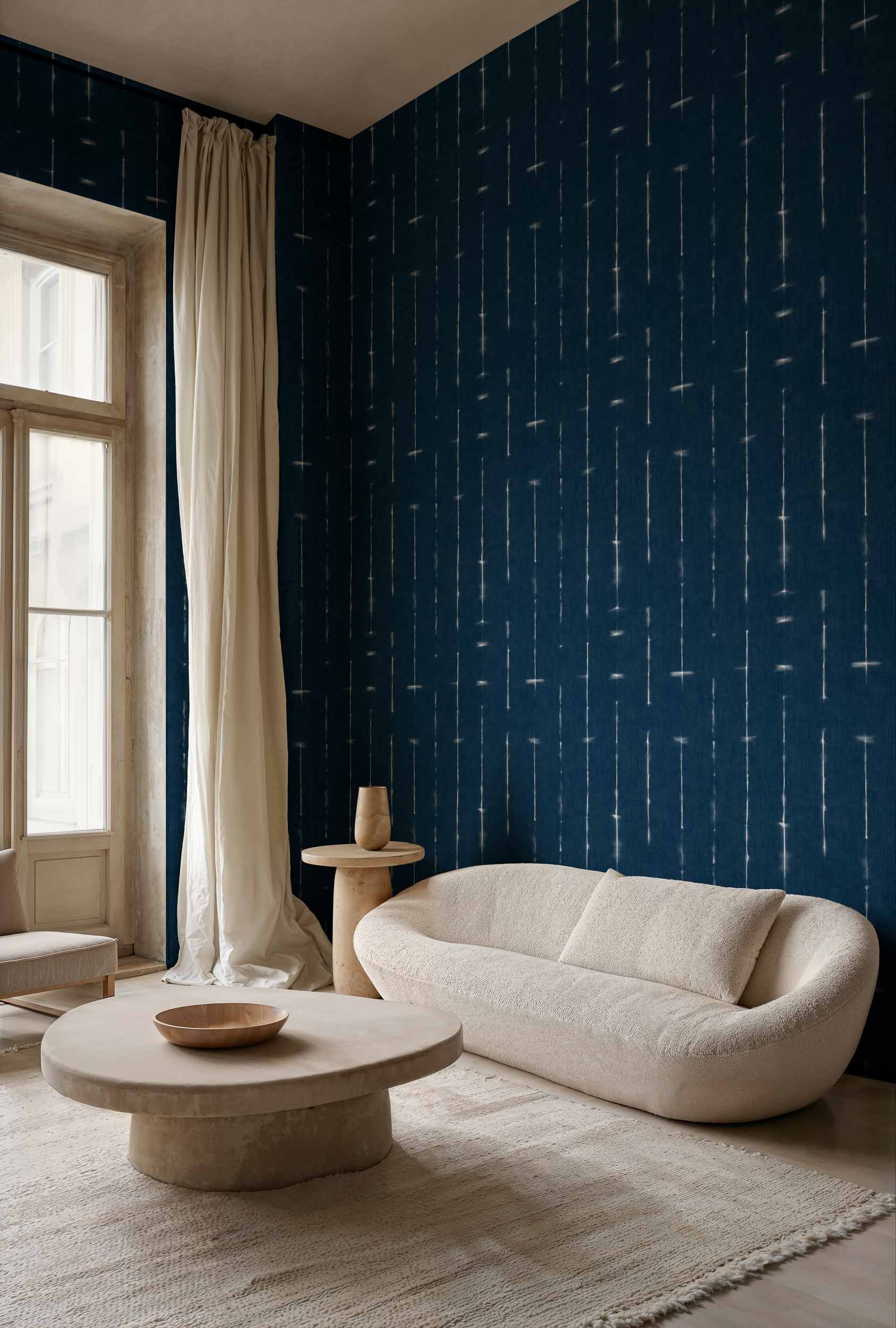 El papel pintado Miura Índigo, con su delicado diseño de rayas en tonos azul y blanco, evoca la sutil fluidez de los susurros del viento.