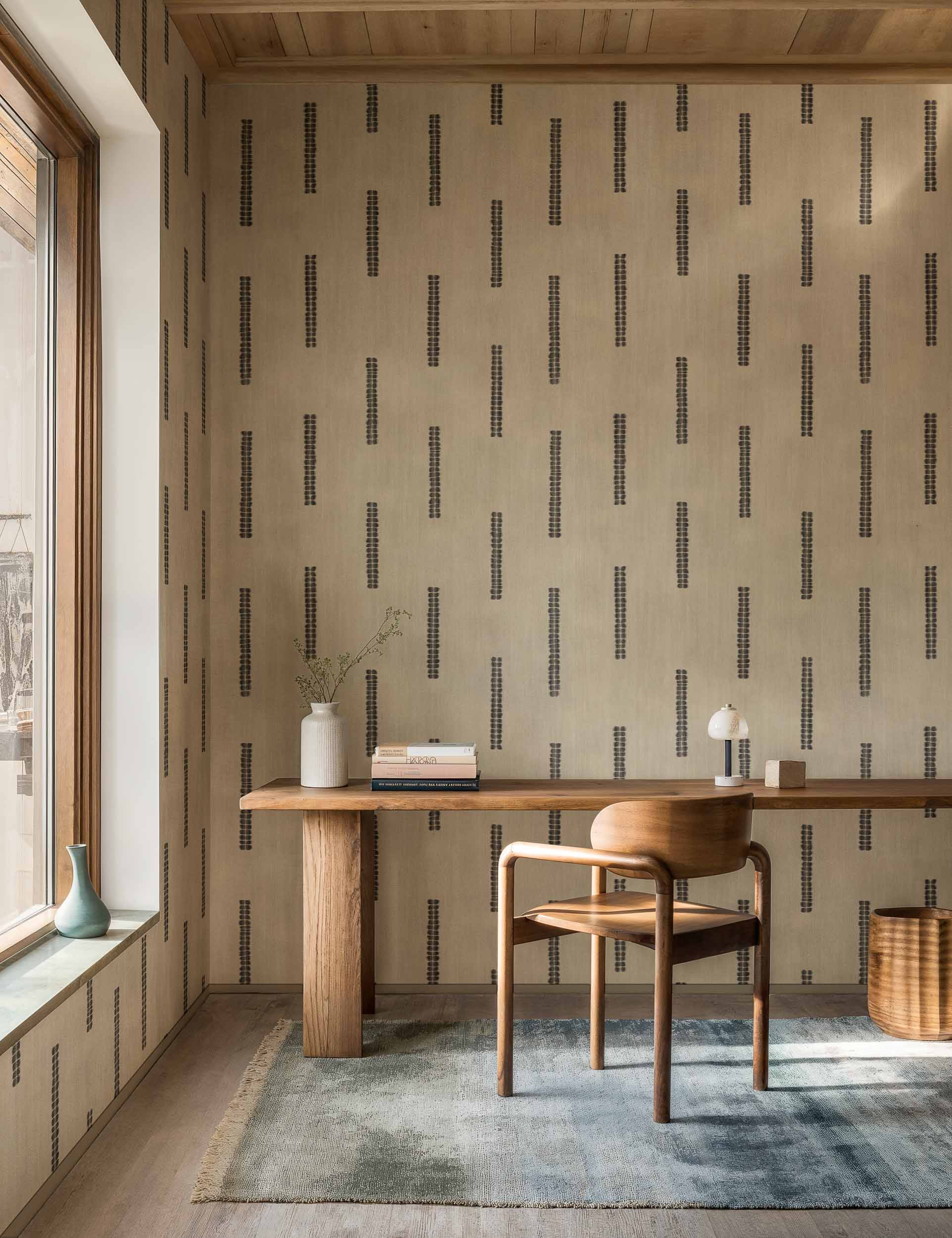 El papel pintado Nui es un diseño de rayas inspirado en la técnica artesanal del shibori. Un papel pintado que refleja la belleza del paso del tiempo a través de ritmos y repeticiones que evocan calma y equilibrio.