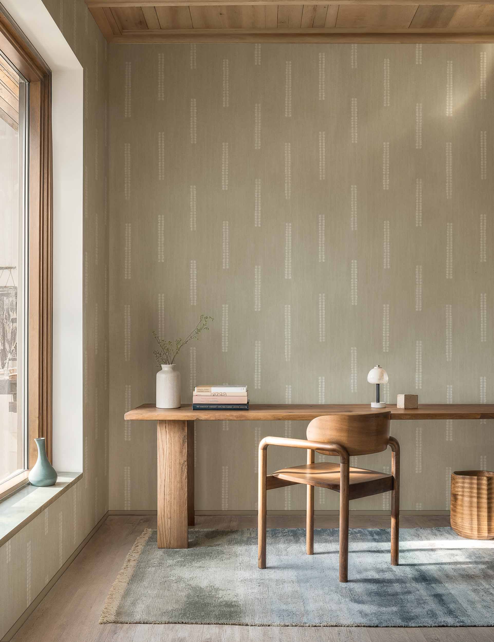 El papel pintado Nui es un diseño de rayas inspirado en la técnica artesanal del shibori. Un papel pintado que refleja la belleza del paso del tiempo a través de ritmos y repeticiones que evocan calma y equilibrio.