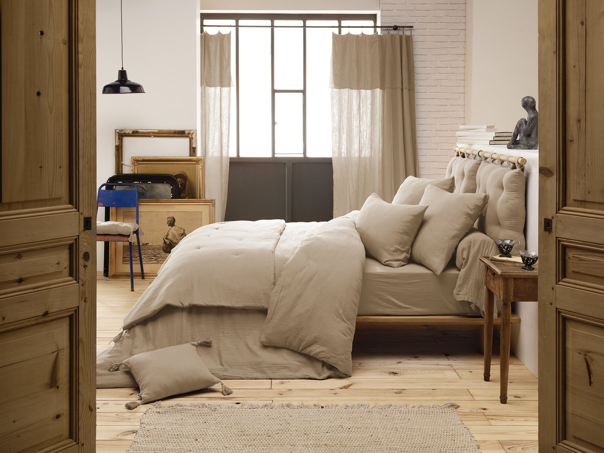 Camino de cama/edredón en gasa de algodón con borlas en las esquinas.