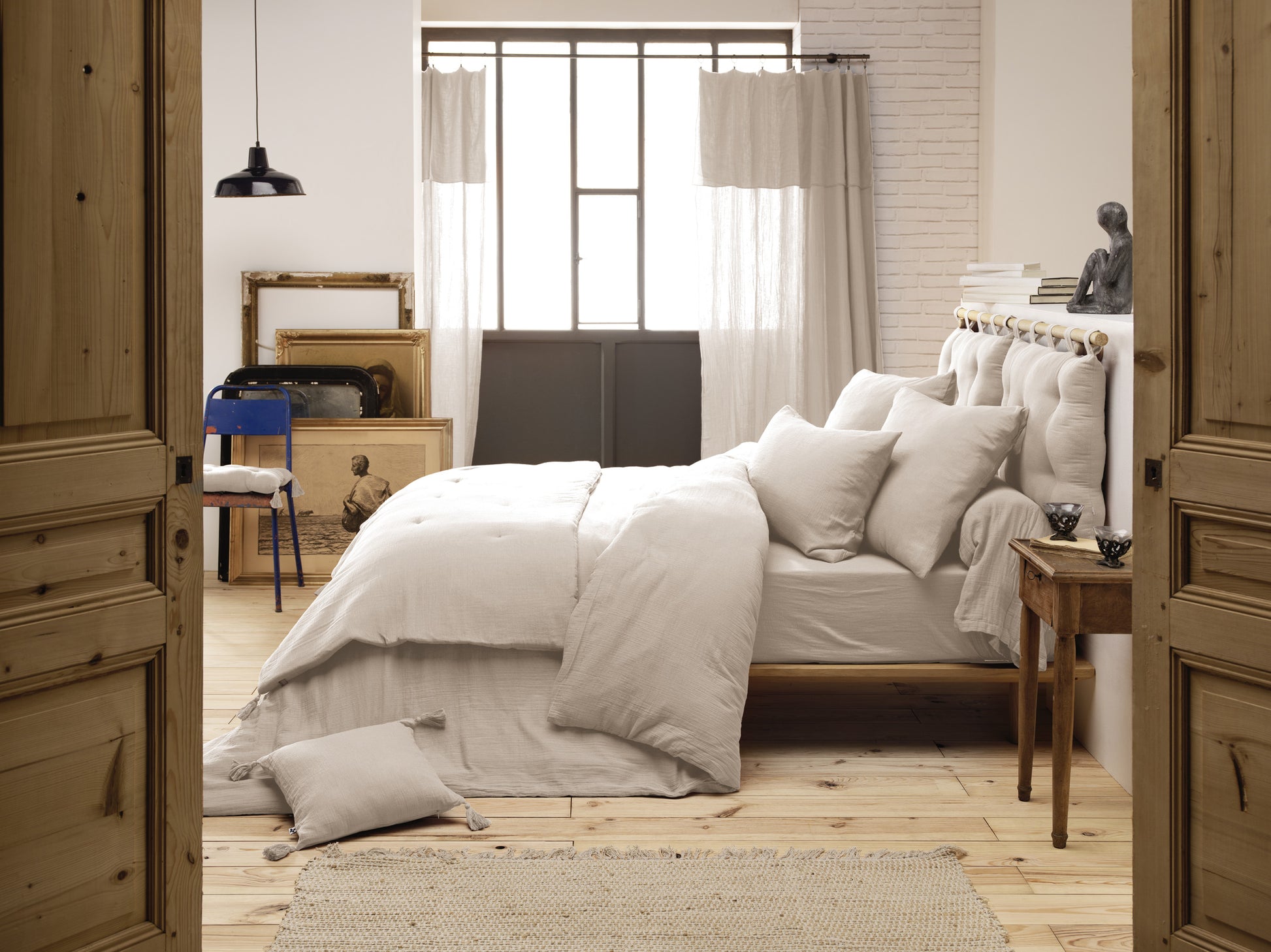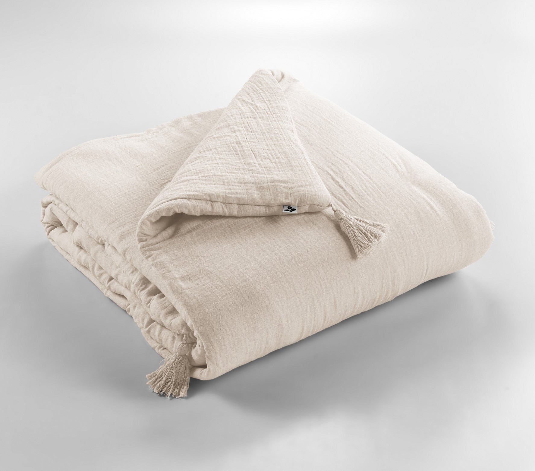 Camino de cama/edredón en gasa de algodón con borlas en las esquinas.