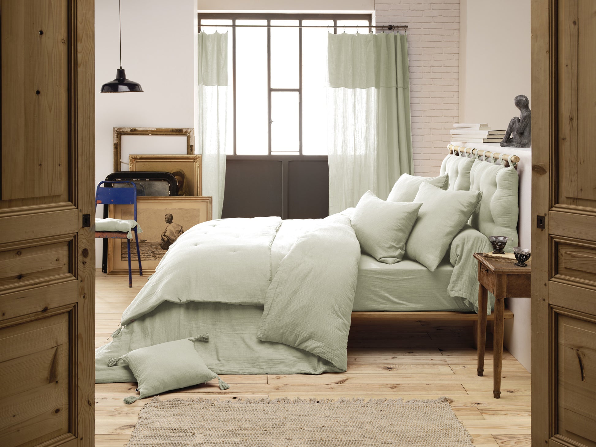 Camino de cama/edredón en gasa de algodón con borlas en las esquinas.