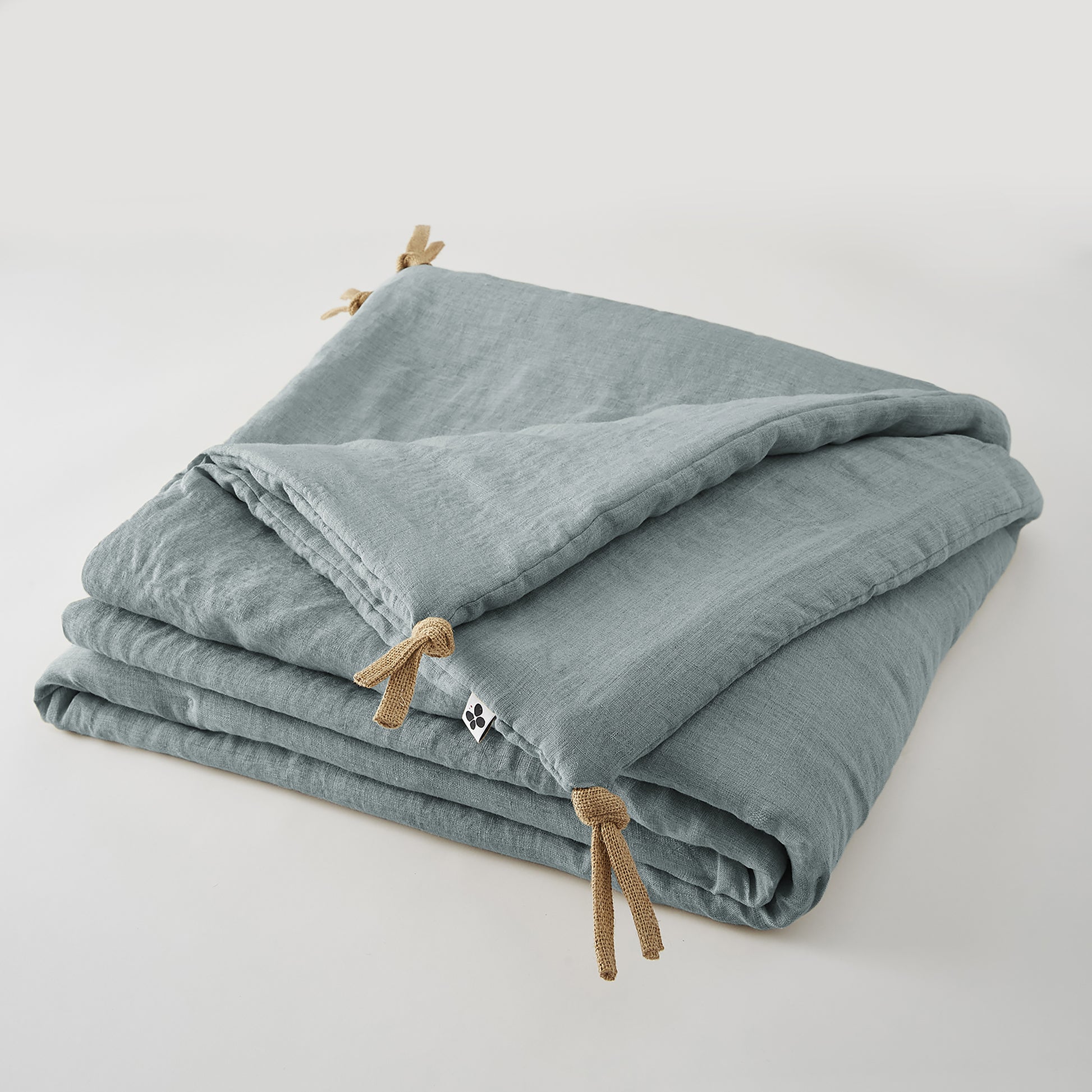 Camino de cama/edredón en lino lavado con pompones de yute en las esquinas.